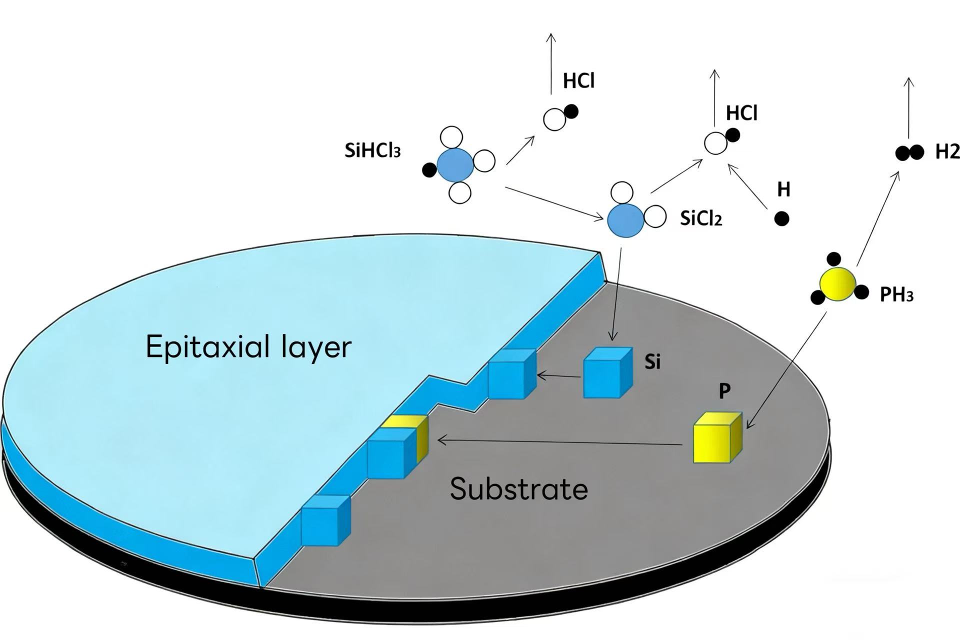 Silicio epitaksijoje paprastai naudojama garų fazės epitaksinė krosnis. Jo principas yra tas, kad silicio šaltinio (pvz., silano, dichlorsilano, trichlorsilano ir silicio tetrachlorido) skilimas reaguoja su vandeniliu, kad susidarytų silicis. Augimo metu vienu metu gali būti įleidžiamos dopingo dujos, pvz., PH3 ir B2H₆. Dopingo koncentraciją tiksliai kontroliuoja specifinis dujų dalinis rezistinis slėgis.