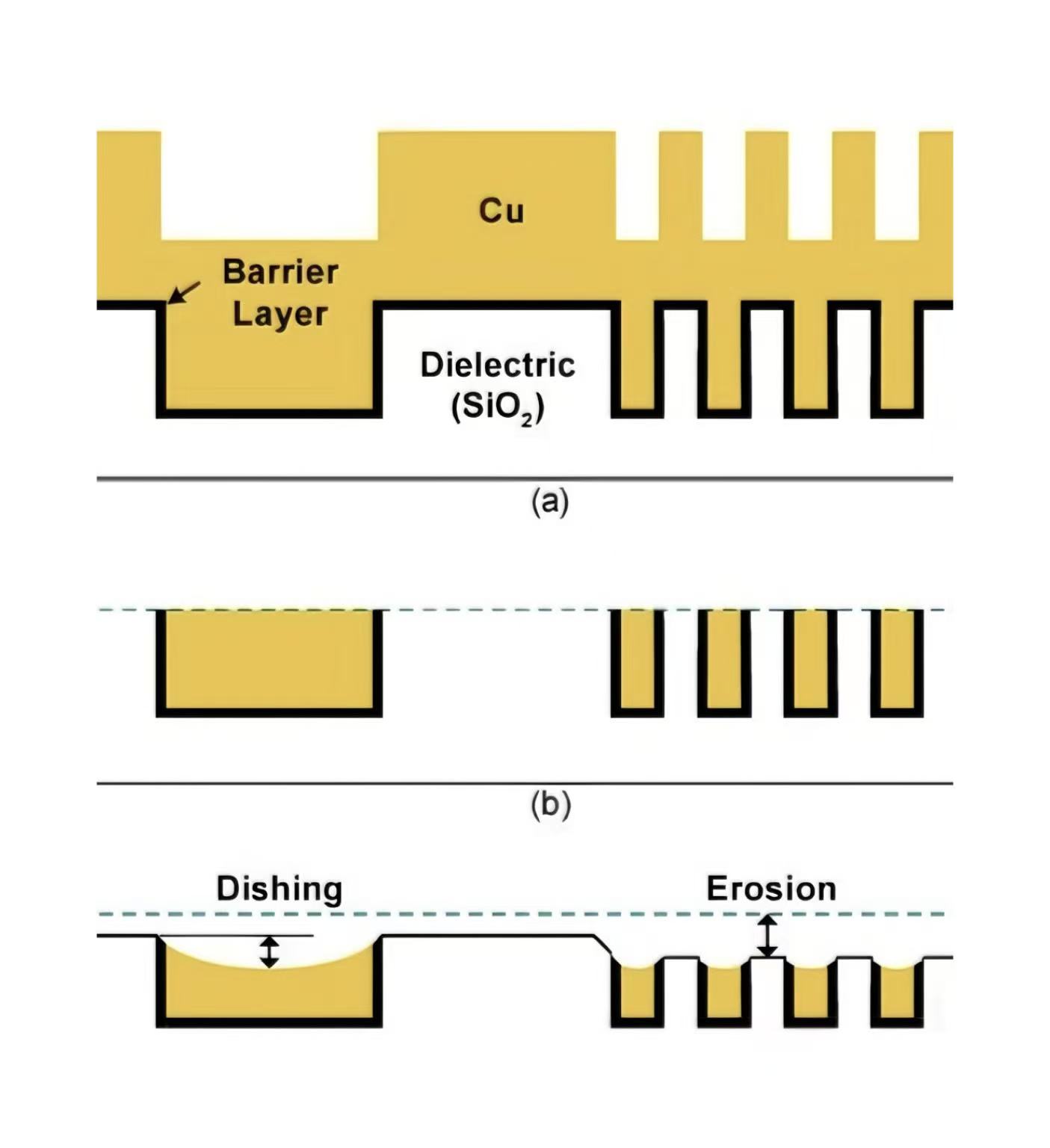 Cheminis mechaninis poliravimas (CMP), kuris sujungia cheminę koroziją ir mechaninį poliravimą, kad pašalintų paviršiaus nelygumus, yra svarbus puslaidininkinis procesas, leidžiantis pasiekti bendrą plokštumą.vaflįpaviršius. Dėl CMP atsiranda du paviršiaus defektai, išblukimas ir erozija, kurie labai paveikia jungiamųjų konstrukcijų lygumą ir elektrines charakteristikas.