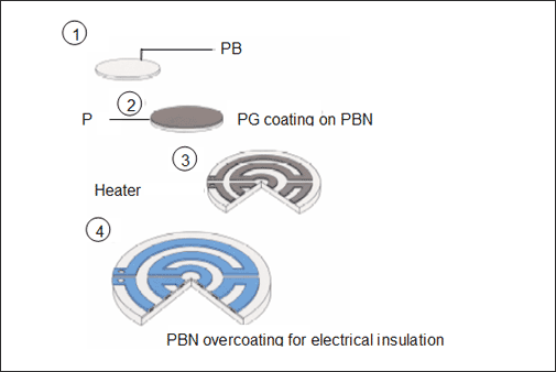 Pirolitinis boro nitrido-pirolitinis grafitas (PBN-PG) kompozicinis šildytuvas yra šildytuvas, kuris naudoja aukštos disponavimo PBN kaip substratą ir naudoja žemo slėgio šiluminio skilimo cheminį garų nusėdimą (CVD) esant žemam slėgiui (žemiau 10Torr) ir aukštą temperatūrą, kad padengtų laidinį PG. Pagrindiniai šio sudėtinio šildytuvo komponentai yra pirolitinis boro nitridas (PBN) ir pirolitinis grafitas (PG). Dėl puikaus atsparumo korozijai ir aukštai temperatūros atsparumui jis daugiausia naudojamas puslaidininkių substrato kaitinimui (naudojamas MBE, MOCVD, dulkinančioje dangoje ir kt.); superlaidininko substrato šildymas; Mėginio šildymas mėginio analizės metu; Elektronų mikroskopo mėginio šildymas; metalo šildymas; Metalo garinimo šildymo šaltinis ir kt.