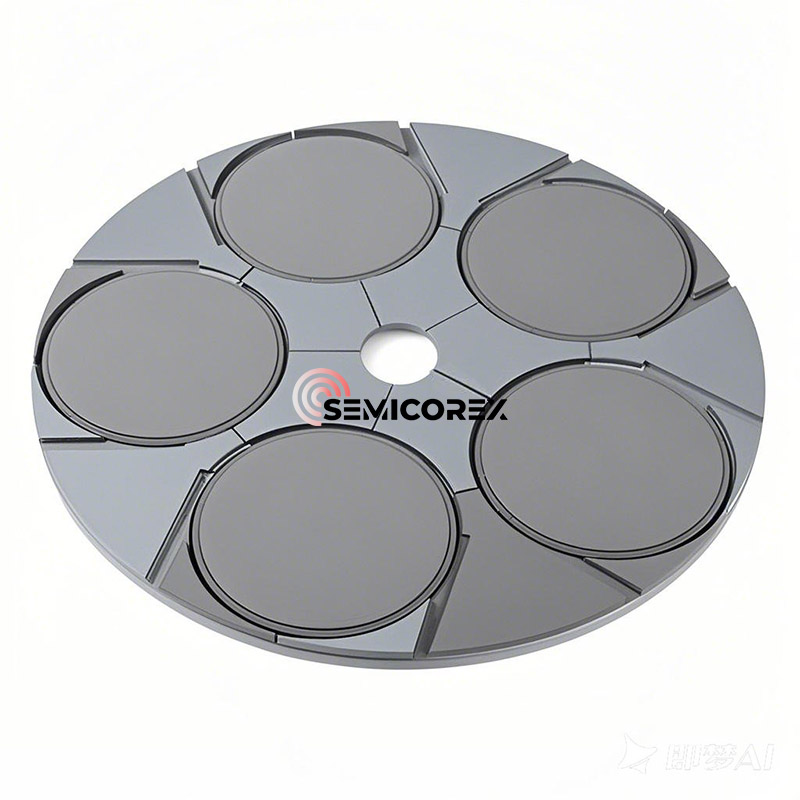 Pirmiausia naudojamas metalo organinių cheminių garų nusėdimo (MOCVD) procese, palydovinė plokštė yra labai svarbi auginant epitaksinius sluoksnius ant puslaidininkių plokštelių. Jis vaidina pagrindinį vaidmenį gaminant pažangių puslaidininkių įrenginius, įskaitant šviesos diodus, SIC ir GAN pagrįstą galios elektroniką, fotoninius ir optoelektroninius komponentus bei aukšto dažnio RF įrenginius. Užtikrinant stabilias šilumines sąlygas ir sumažinant užteršimą, palydovo plokštelė garantuoja pastovų epitaksinio sluoksnio augimą, todėl pagerina vaflių valdymą ir didesnį derlingumo greitį. Jo optimizuotas dizainas efektyviai apsaugo vaflių atramą, sumažina defektus ir užtikrina tikslumą visuose puslaidininkių apdorojimo etapuose.